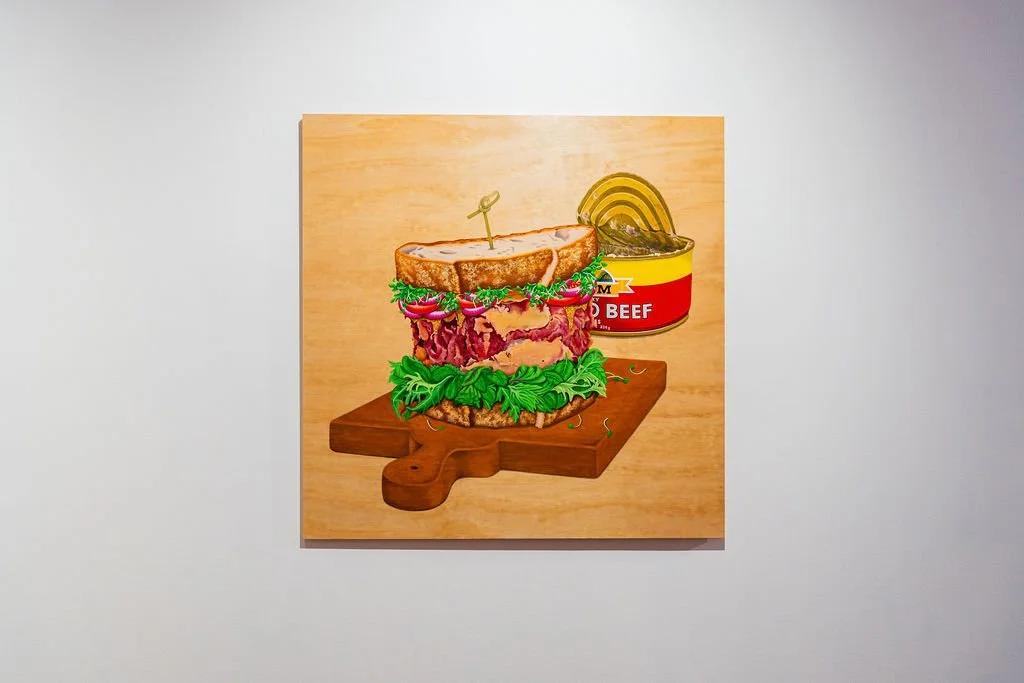 Born and raised in Kirikiriroa, Hamilton, multidisciplinary Samoan artist Fatupaito calls on the simple and instantly recognisable pantry staple; corned beef. Fatupaito’s installation features two large-scale still-life acrylic on wood paintings. The first portrait, titled Palusami Wrapped in Tinfoil, depicts a tinfoil wrapped palusami (Samoan dish made with corned beef, coconut milk, and taro leaves) glimmering in chrome; imitating something sculptural, something titanium. The second, Lunch is Served, is a corned beef sandwich layered with fresh greens, red onion, and tomato slices, nestled between two thick slices of white bread. It sits on a wooden board, accompanied by an open can of corned beef. The sheer scale, colour, and placement of both these portraits emit a feeling of grandeur making one almost forget that these portraits are depictions of corned beef. While I prefer my corned beef boiled in a thick, oily, and spicy broth of indomie noodles, Fatupaito’s work tempts my gaze and forces me to ponder on how I should enjoy corned beef.